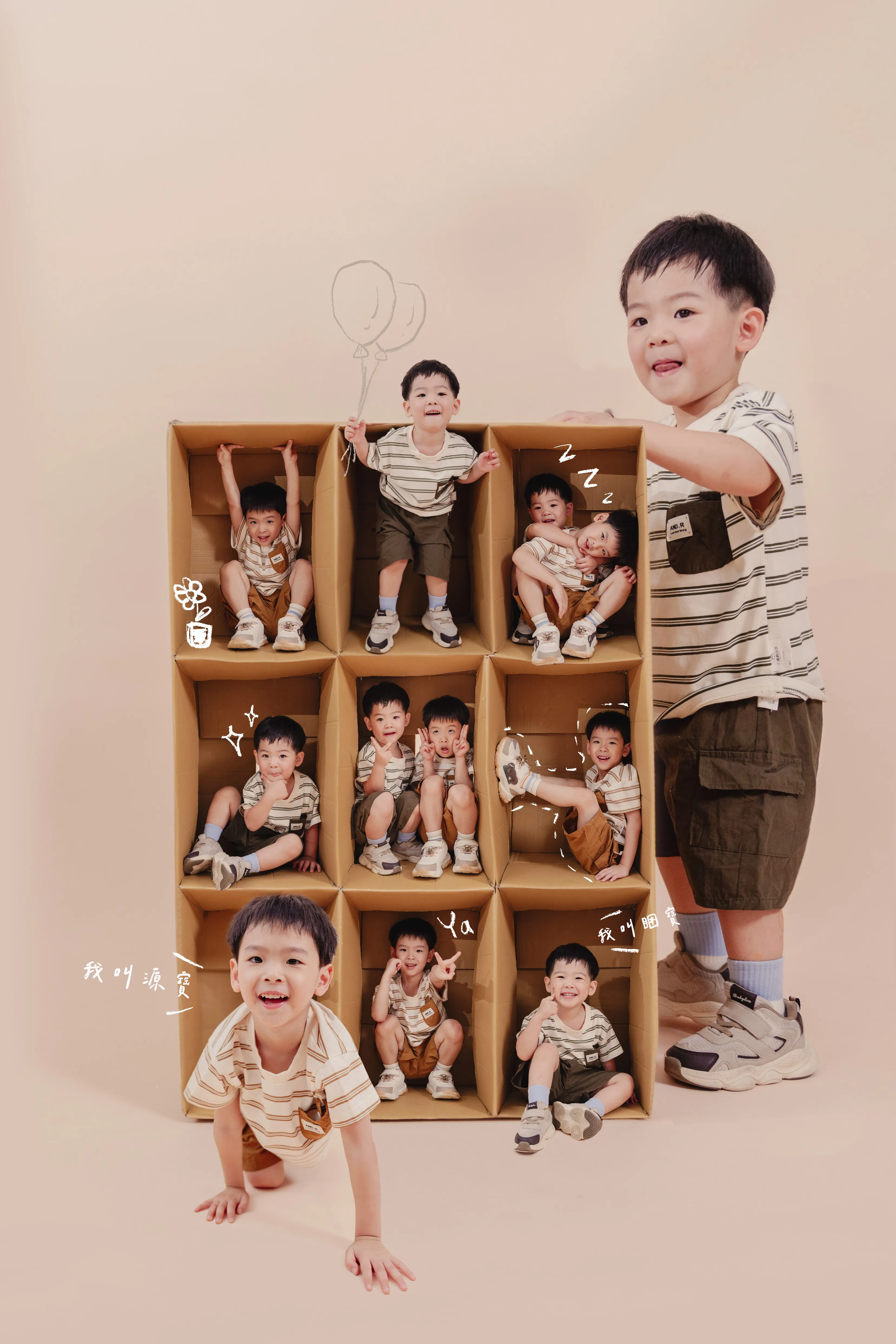 看著孩子們在箱子裡擠來擠去、分享玩具,或是忍不住互相打鬧,在玩鬧中自然流露的小表情與笑聲,正是九宮格拍攝最動人的地方。